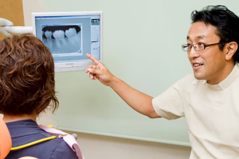 まず、患者さまが現在お困りのことはもちろん、不安に思われていることや今後の治療に対する希望などを個室で拝聴いたします。その後、お口の中の詳しい検査(むし歯のチェック・歯茎の検査etc.)、口腔内写真(お口の写真)、X線写真、歯型の採取などの資料を集めさせていただきます(すべての資料をそろえるのに2回ほどかかります)。もちろん、お痛みなどがあれば、初回に対応させていただきます。